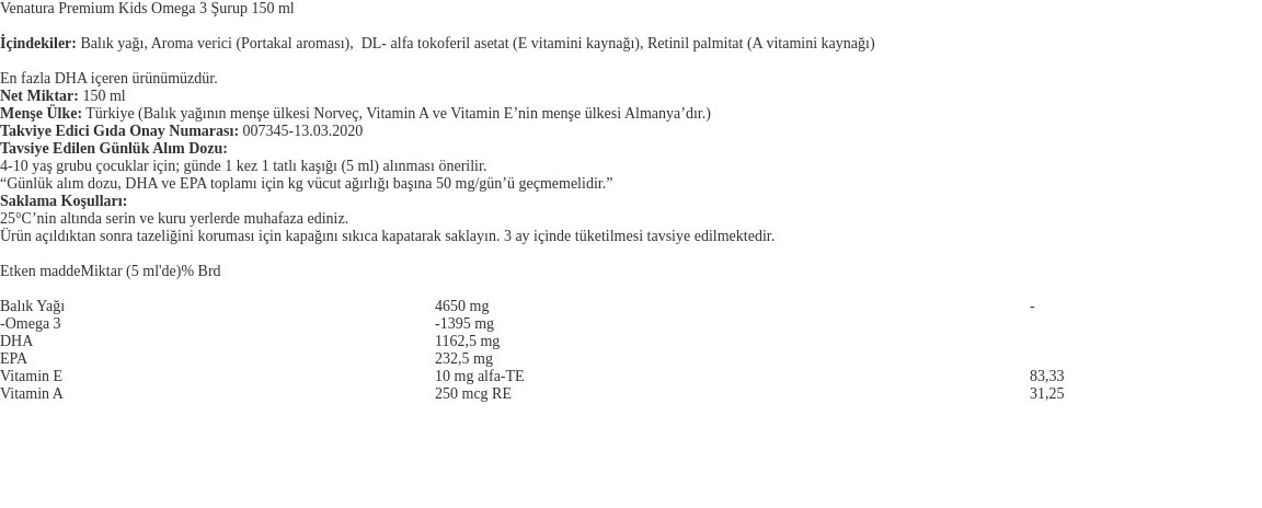 Venatura Premium Kids Omega3 Şurup 150ml